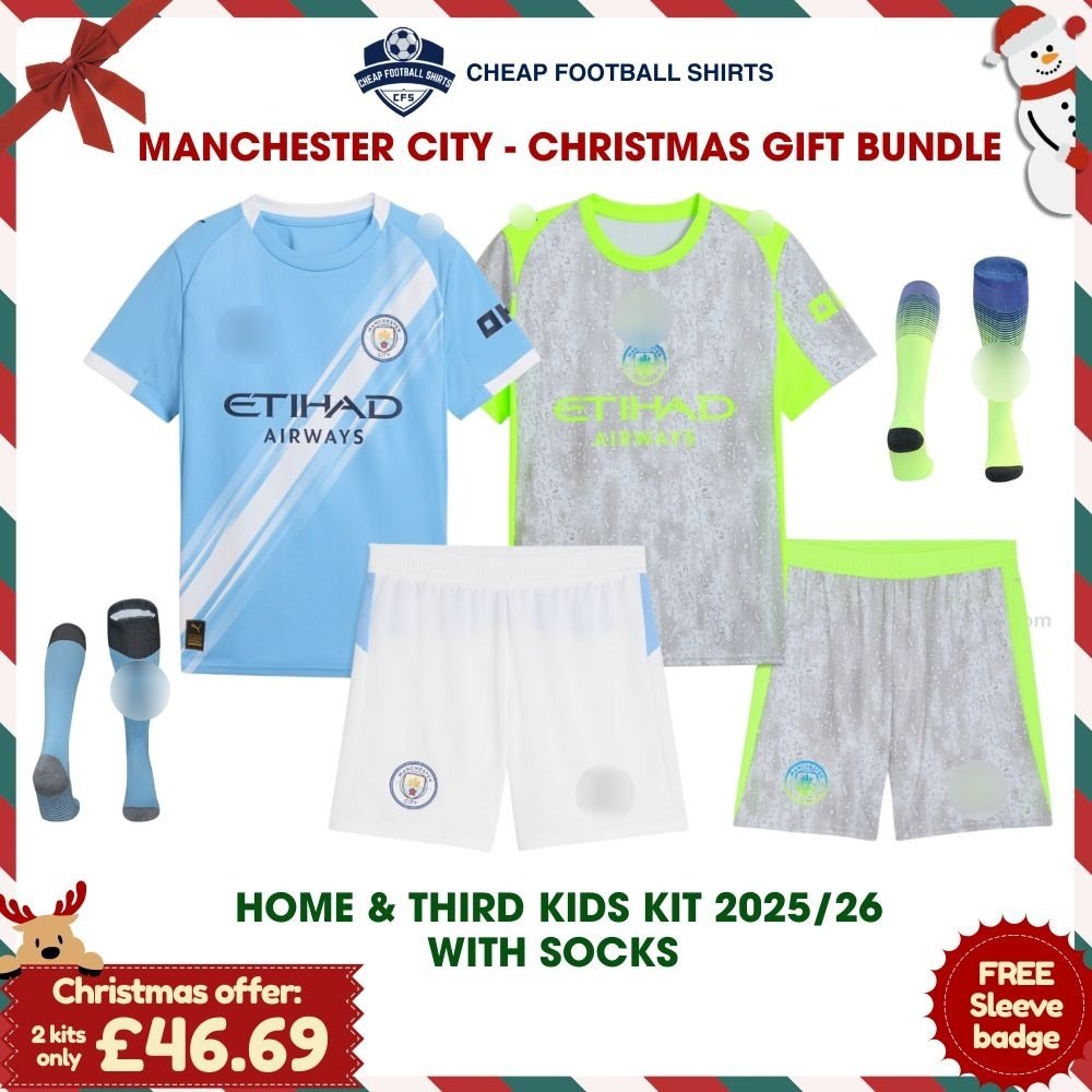 Celebrate your Manchester City pride with the Manchester City FC Christmas Gift Packs – Home & Third Cheap Football Kits 2025/26.