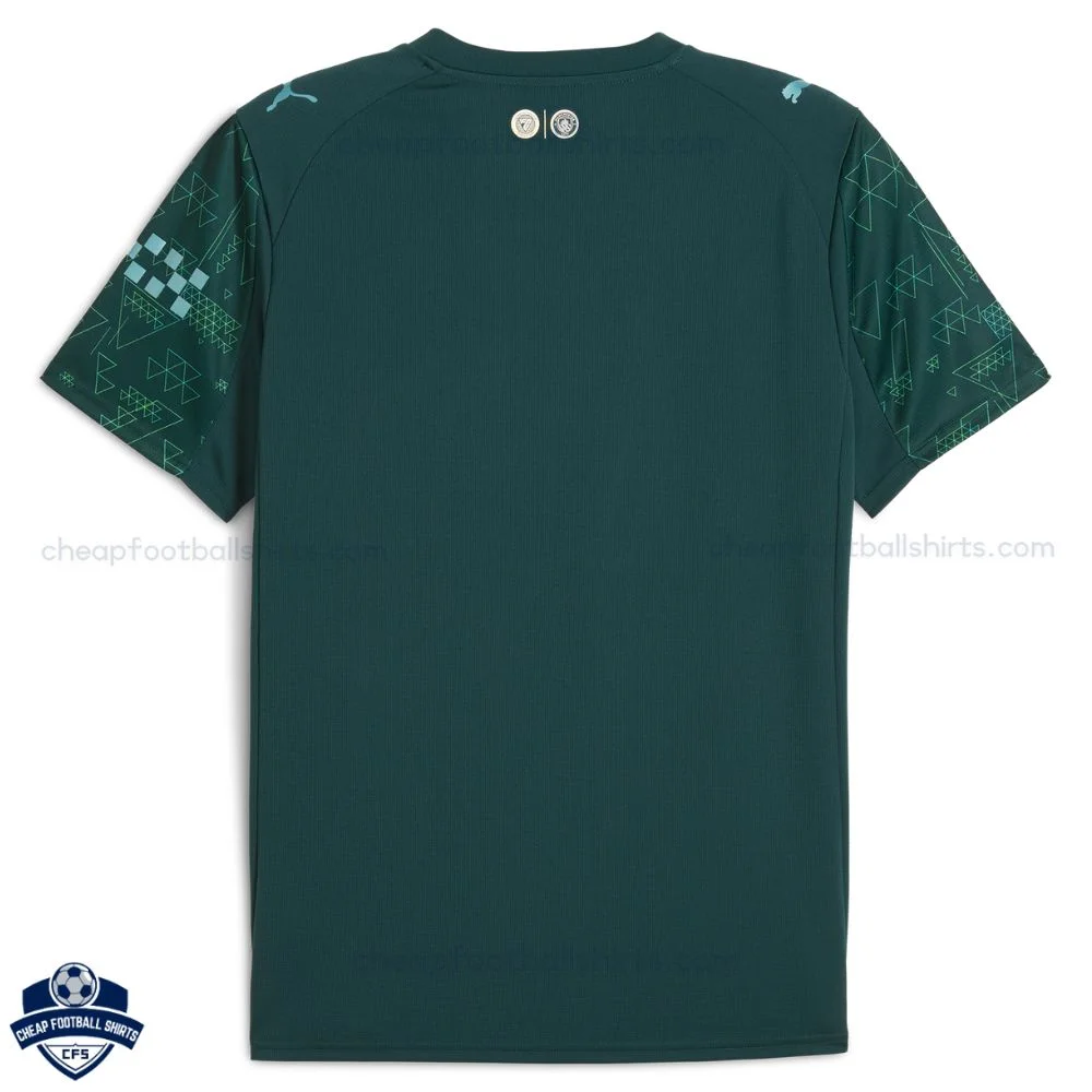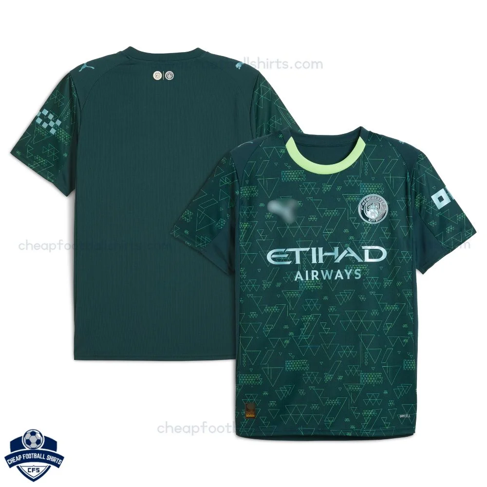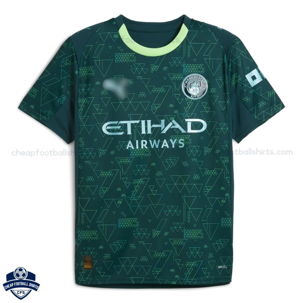 Show your Manchester City spirit with the Manchester City Fourth Men Football Shirt 25/26 – a sleek dark green replica featuring intricate teal geometric triangle patterns across the body and sleeves, accented by a vibrant neon lime collar for a futuristic, high-tech edge.