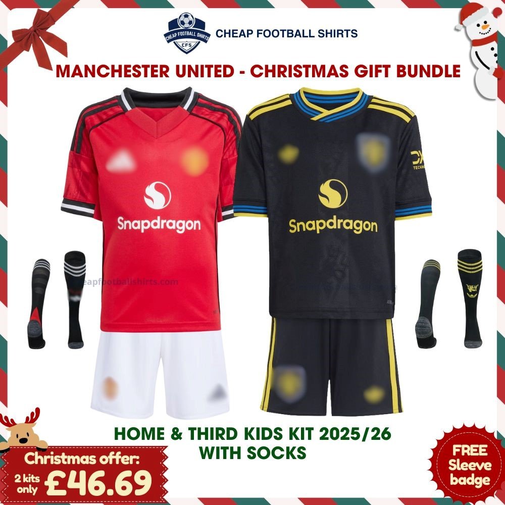 Celebrate your Manchester United pride with the Manchester United FC Christmas Gift Packs – Home & Third Cheap Football Kits 2025/26.