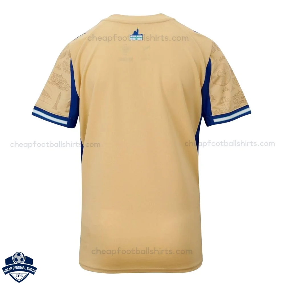- Authentic Design: Elegant gold tones, intricate all-over graphic detailing, blue trim accents, and prominent sponsor branding give this shirt a unique collector-worthy look.